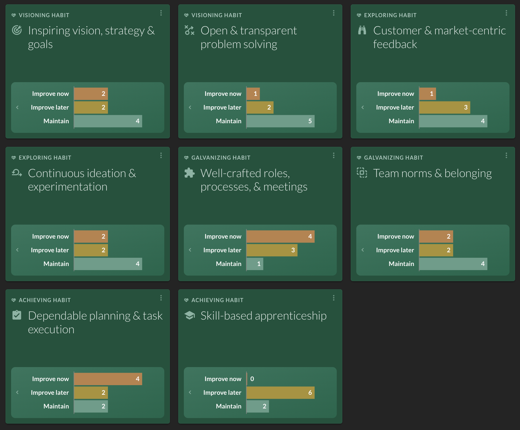 The Habit Checks also ask questions about the top eight habits a team can use to improve its motivation and performance. Motivation is your fuel gauge and habits are your engine.